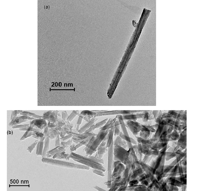 TEM micrographs were used to investigate the morphology of halloysite nanotubes. Fig. 1 shows the TEM images of the halloysite nanotubes in two magnifications. The hollow tubular structure is clearly visible from TEM images. The halloysite is predominately tube with a length of 0.5-1 μm and an inner diameter of 20-30 nm.