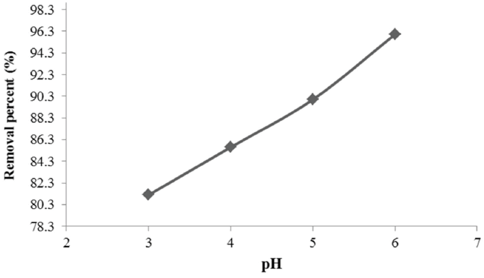 The pH should be an important factor affecting the uptake of heavy metal ions from aqueous solutions by the adsorbent. The pH values selected were prior to the precipitation limit of the metal ions. As can be seen in Fig. 3, removal percent increased with increasing solution pH and a maximum value was reached at around pH 6.00. Increasing pH from 3 to 6 resulted in highest removal percent. This may be attributed to the increased solubility of Zn (II) at high pH values. Taking these theories and results into account, pH 6 was chosen as the best level for further experiments. The removal of Zn (II) from water by HNTs was found to be dependent on the solution pH value. The increase in the metal removal as the pH increases is on the basis of a decrease in competition between proton and metal species for the surface sites, and by the decrease in positive surface charge, which results in a lower columbic repulsion of the sorbing metal ions.