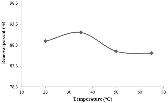 It seems that the mobility of molecules increases with increasing temperature up to 35°C that facilitate the formation of adsorbed layers. Further increasing of temperature could decrease the adsorption capacity due to desorption [3].