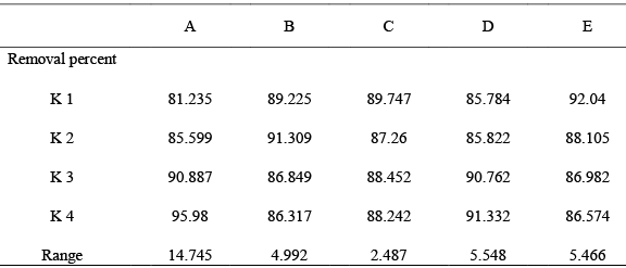 The results of the Taguchi method experiment are shown in Table 3. From the results presented in Table 3, we can find out that for the combination of the five factors, the optimum is the condition combination in experiment fifteen, that is, pH 6.00, contact time 40 min, Temperature 50°C, adsorbent mass 0.4 g, and initial Zn (II) concentration 50 mg/L. Under this condition, the removal percent can reach 99.76%. For all of the experimental conditions, experiment 14 can reach the highest adsorption capacity of about 132.1663 mg/g. The results of range analysis are shown in Table 4. K1, K2, K3 and K4 are the average values of the results of each level in the Taguchi method experiment. Range values are the average values of K1, K2, K3 and K4. Based on the principle of “The larger the better,” range analysis indicates the best levels for each single factor and shows which factor is the most important in the adsorption process. The results are concluded in Table 3.