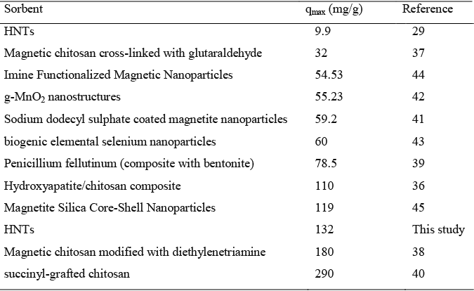 Various adsorbents have been used to removal of Zn ions. The maximum adsorption capacity of different adsorbents were collected in Table 7 and compared with the present work [29, 35-44]. Although direct comparison of different adsorbents is difficult due to differences in experimental conditions, the adsorption capacity of HNTs in the present work is higher than that of magnetic chitosan cross-linked with glutaraldehyde, penicillium fellutinum (composite with bentonite), hydroxyapatite/chitosan composite, imine functionalized magnetic nanoparticles, g-MnO2 nanostructures, sodium dodecyl sulphate coated magnetite nanoparticles, biogenic elemental selenium nanoparticles, magnetite silica core-shell nanoparticles, and HNTs reported in another paper and lower than that of magnetic chitosan modified with diethylenetriamine and succinyl-grafted chitosan. The excellent advantages of HNTs such as low cost, renewability, environmentally friendly feather, and naturally availability as well as supplying appropriate experimental condition make HNTs suitable and efficient adsorbent to removal of Zn ions [29].