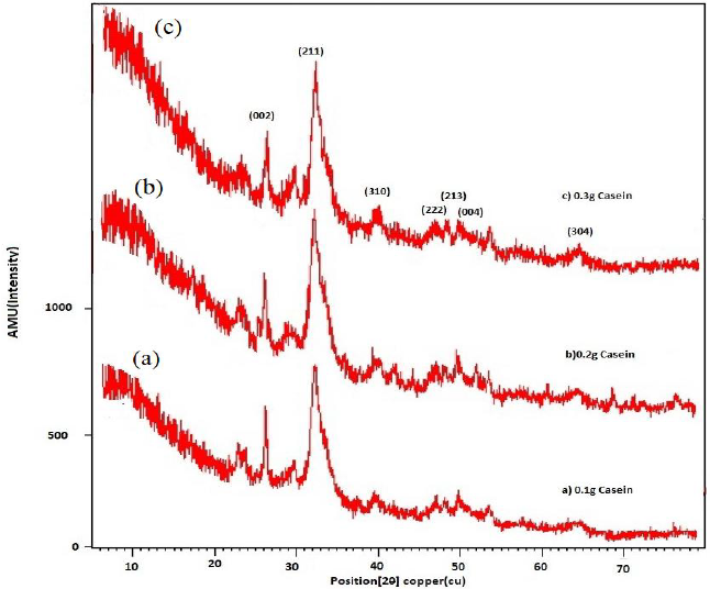 Fig. 1 shows XRD diffraction patterns of as prepared sample, at the presence of: a) 0.1g, b) 0.2g and c) 0.3 g Casein. All the main diffraction peaks recorded at (002), (211), (310), (222), (213) and (304) plane, were characteristic of the monophasic low crystalline HA with ICDD PDF No: 00—001-1008, matching well with the hexagonal system (P63/m). Very interesting point in this figure was appearance of the broad peaks width for the samples with different concentration of casein and a sample’s broadening peak’s width is in general a good evidence for explaining formation of nanostructured materials at the presence of a substrate. Average HA crystalline size was calculated using Scherrer`s [13] equation as follows:
