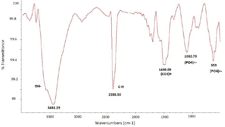 Functional groups associated with hydroxyapatite were identified by FTIR spectroscopy. Recorded FTIR spectrum for the sample synthesized in the presence of 0.3 g casein is given in Fig. 2. In this figure, the presence of hydroxyl group in the apatite lattice is well confirmed by absorption broad bands at 3571 cm−1 and 629 cm−1, attributed to the stretching and flexural modes of hydroxyl (OH−) group. The IR characteristic peaks of phosphate groups appeared between 1090-1030 and 600-560 cm-1originated from bending and stretching vibration mode of phosphate of HAp respectively [14-15]. The absorption bands at 1420 cm-1 and 875 cm-1 suggest the presence of CO3-2 in hydroxyapatite structure [16]. Likewise, the other stretching vibrations for carbonyl and phosphate groups were also observed as reported. The peaks appearing at 2924 cm–1, 2854 cm–1 and 2956 cm–1 are assigned to the vibrating absorption of C-H asymmetric and symmetric stretching in CH2 and C-H asymmetric stretching in CH3 respectively [17]. All peak’s assignment were shown in Table 1.