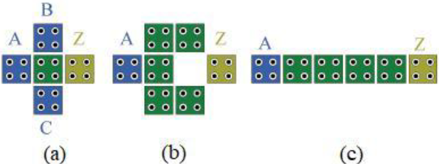 The foremost logical structures formed by the electro-mechanically coupled quantum cells comprises of Binary Wire, conventional seven-cell inverter and the Majority Voter. The binary wire simply carries the information from one level to the next level of the QCA circuit. The Boolean inverter takes the input, inverts it and passes the same on to the output cell. The majority voter fetches the logic of the three inputs A, B and C. It decides the majority among these three logics and generates output Z in favour of the majority logic. Such computation of Majority Voter is validated by the equation Z = M (A, B, C) = AB + BC + CA. The structures of binary wire, conventional seven-cell inverter and Majority voter are shown in Figs. 2(a) Majority Voter, (b) Seven Cell Inverter and (c) Binary Wire respectively.