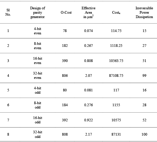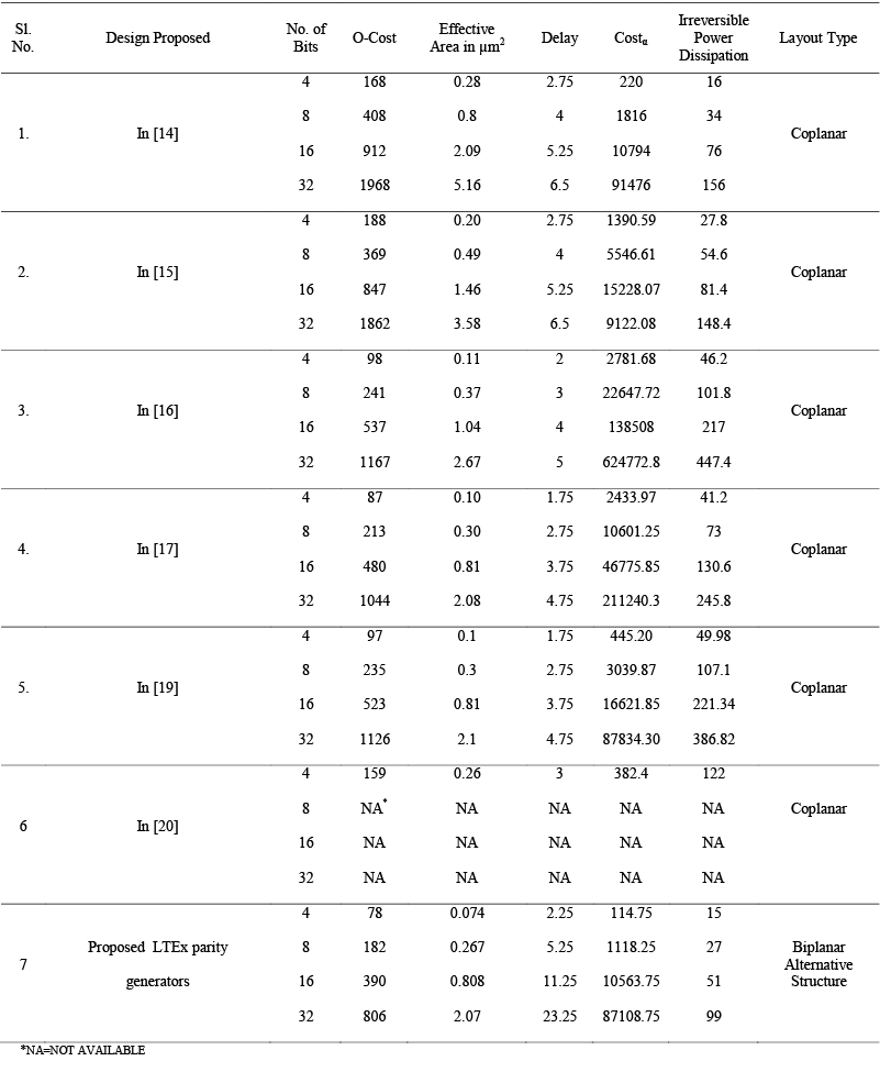 The proposed 4-bit, 8-bit, 16-bit and 32-bit even LTEx parity generators are compared with the existing designs of [14-20] in terms of O-Cost, Effective Area in nm2, Costα and Irreversible Power Dissipation. The 4-bit LTEx parity generator requires 10.34% less O-Cost than the optimized 4-bit Singh parity generator counterpart [17]. The 4-bit LTEx parity generator consumes sharp 24% less effective area than the Singh counterpart [17] and Sasamal counterpart [19]. Till date, the 4-bit Hashemi parity generator [14] has been reported as the best design in terms of Costα and Irreversible Power Dissipation. However the Costα for 4-bit LTEx parity generator is counted as 114.75 in Table 4 whereas the value becomes 220 for the Hashemi parity generator [14]. On the other hand, the Irreversible Power Dissipation becomes 16 for the former parity generator [14]. Hence sharp 47.84% reduced value of Costα and 6.25% less power consumption in comparison to Hashemi 4-bit parity generator [14] can be noted from Table 4.