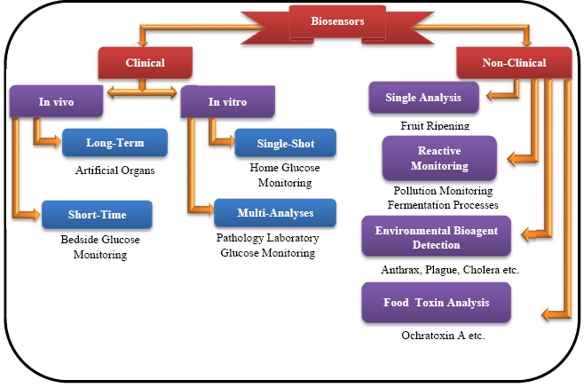 The working of any biosensor can be explained with the following example. In a biosensor, a particular “bio” element can recognize a particular analyte followed by the “sensor” element which can transduce the change of the biomolecule into a measureable signal in the form of electrical, optical, piezoelectric, calorimetric etc. signal. The bio element used in the sensor should be highly specific and sensitive to the analyte which is to be detected and should not detect any other analyte. Biosensors can be classified as follows depending on the mechanism of transduction: (i) Optical biosensors, (ii) Calorimetric biosensors, (iii) Ion-Sensitive Field Effect Transistor (ISFET) biosensors, (iv) Resonant biosensors, (v) Electrochemical and (vi) Reagentless biosensors. Electrochemical biosensors can be further classified into (a) Conductometric, (b) Amperometric, and (c) Potentiometric [10]. Acquiring high market potential, the blood glucose sensing is the major application so far [11]. The applications of biosensors are versatile including biomedical industry, military, environmental pollution monitoring etc. as shown in Fig. 2.