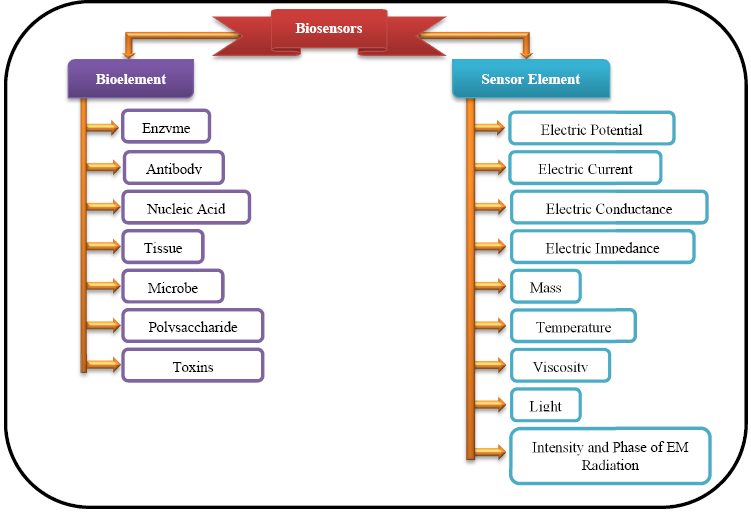 The basic component of a biosensor is the bio-element and the sensor-element (Fig.1). There are different types of bio-elements and sensing element being used in biosensing [12-17] and some of them are listed in Fig. 3.