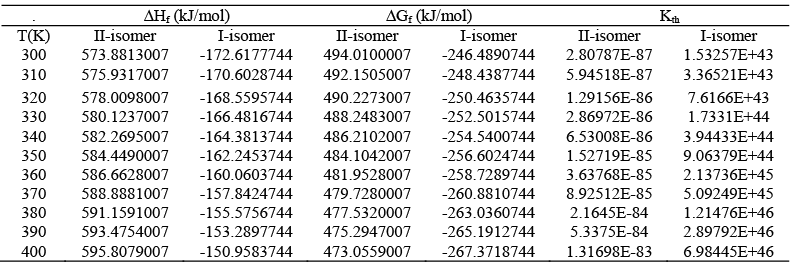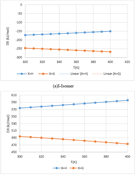 Gibbs free energy changes (ΔGf) and thermodynamic equilibrium constant (Kth) of the desired reactions are calculated and listed in Table 2. It can be found, ΔGf and Kth values for the formation reaction of the I-isomer are considerably negative. Therefore, it can be predicted this process is spontaneous. It should be noted that the temperature has a substantial influence on the formation reaction of I-isomer because the acquired results show that by enhancing the temperature the values of ΔGf and Kth have become more negative and positive respectively. Hence, temperature rising can catalyze this reaction. However, it seems the formation reaction of the II-isomer is non-spontaneous due to the achieved positive ΔGf and small Kth values (Fig. 2 (a, b)). It can be observed good linear relationships between ∆G and temperature: