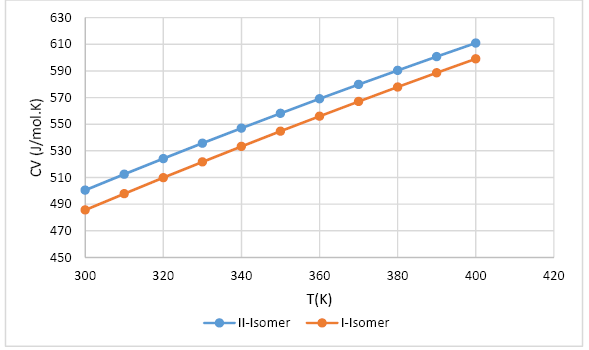The calculated Specific heat capacity (Cv) Values for the derivative products of PATO and B12N12 at different temperatures are presented in Table 2 and (Fig. 3). The obtained heat capacity values indicate that the heat capacity of PATO is lower than its derivatives with B12N12 in both of the I-isomer and II-isomer at all of evaluated temperatures. The specific heat capacity is the amount of heat per unit mass required to raise the temperature by one degree Celsius, so it causes low energy increases the material temperature. Less specific heat capacity values of PATO shows that energetic properties of PATO are greater than its derivations. Heat capacity is increased with increasing molecular weight which is illustrated in Table 3 and Fig. 3. Therefore, the sensitivity of PATO to the shock and heat has reduced sharply after junction to B12N12.