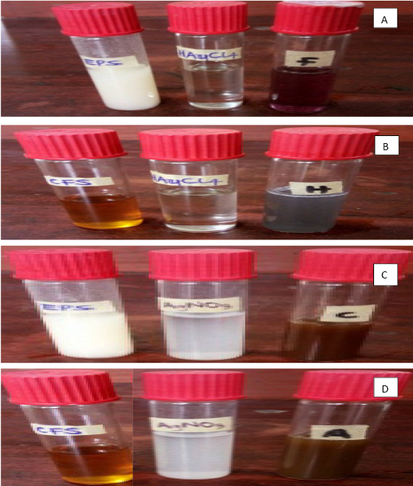 The greenly synthesized AuNPs and SNPs using the EPS and CFS were observed for a change in colour in comparison to control as a visual method of detection of nanoparticles biosynthesis.