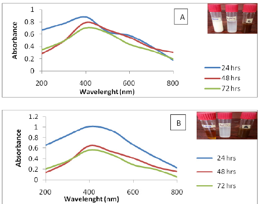 Fig. 2c-d shows the UV-vis spectra of WCEPSSNP and WCCFSSNP at 24hrs, 48hrs and 72hrs of incubation. The peak was also observed at 400 nm at 24hrs, 48hrs and 72hrs.