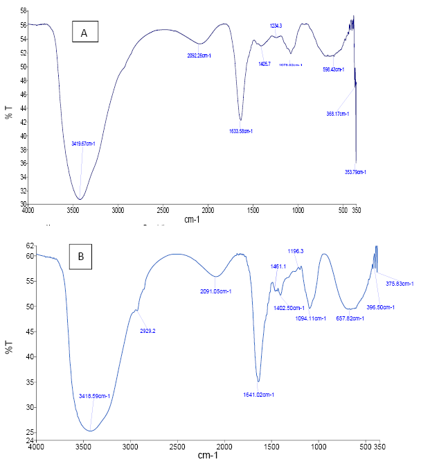 The morphological compositional structure of the AuNPs and SNPs was analyzed by Scanning Electron Microscopy. The chemical structures of the nanoparticles were determined using FTIR and the functional groups obtained were used for the nanoparticles characterization. The FTIR spectra of the nanoparticles were analyzed using FTIR spectroscopy (Shimadzu) operated at resolution of 4 cm-1. For the measurement the dried samples were powdered with KBr pellets and pressed on a mold. The spectra were recorded at a wave range of 500-4000 cm-1.