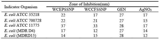 WCEPSSNPs showed maximum activity against E. coli ATCC 11775 (37 mm) followed by E. coli ATCC 35218 (22 mm) and E. coli ATCC 700728 (22 mm) and E. coli D4 (17 mm). The least activity was seen in E. coli D15 (14 mm) as compared to gentamicin.