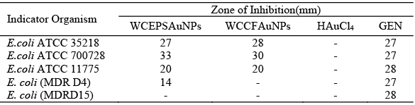 WCEPSAuNPs had maximum inhibitory effect against E. coli ATCC 700728 (33 mm), followed by E. coli ATCC 35218 (27 mm), E. coli ATCC 11775 (20 mm), as compared to gentamicin. The least activity was recorded against E. coli MDR D4 (14mm). There was no activity against E. coli D15.