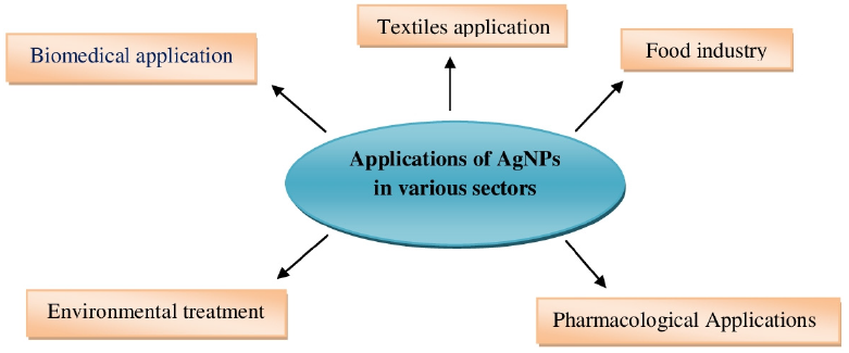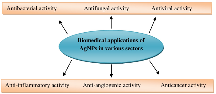 Owing the exceptional properties, AgNPs have been used extensively in household implements, the health care industry, for food storage, environmental and biomedical applications. Several reviews and book chapters have been dedicated to the assorted areas for application of AgNPs. Here, we explore the applications of AgNPs in numerous biological and medical science field, i.e medication, antifungal, antiviral, medicine, anti-cancer, and anti-angiogenic. Here, we utterly addressed previously-published seminal papers and conclude with current information and outcomes. A schematic diagram representing various applications of AgNPs is providing in Fig. 2.