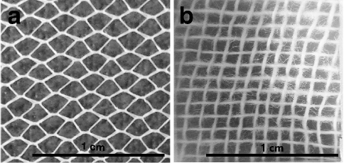 The data from our previous study [32] was also used in this experiment. Briefly, the voltage, distance and feed rate were chosen as 20 kV, 5 cm and 0.2 ml/h, respectively. The model of electrospinning unit was DAIWAHA, Korea. Two patterns of meshes as shown in Fig. 1 were used: one with pentagonal meshes (Fig. 1a), 66.75% free area and a mesh of 7 (cm-1); the other one with tetragonal meshes (Fig. 1b), 33.375% free area and a mesh of 9.5 (cm-1).