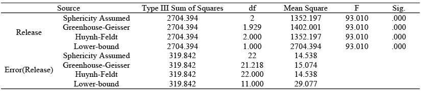 All statistical analyses were performed using the SPSS statistical software program and ANOVA test was used for measurement. In this section, due to the repetition performed at different times, the condition of independence between communities was not established; therefore, a repeated measurement test was used. At first, Mauchly’s sphericity test was used. In this method, SPSS software was used to calculate the variance-covariance matrix, and then, the Mauchly’s sphericity test-uniformity test for variance-covariance was performed to consider the establishment of F statistics.