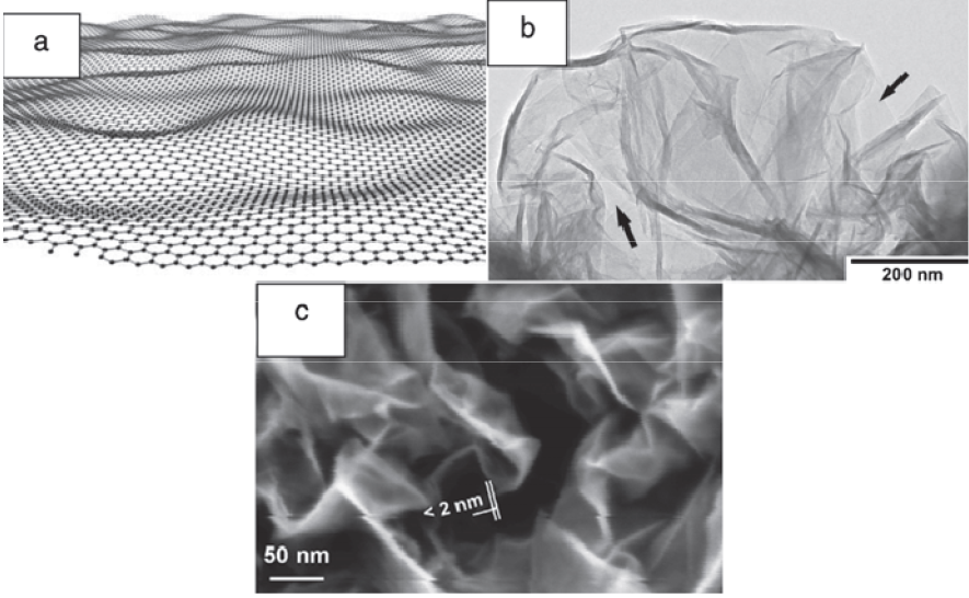 Graphene, as one of advanced carbon nanomaterials, is a 2-dimensional single sheet of carbon atoms arranged in a hexagonal network. Graphene is the basic building block for graphitic materials of all other dimensionalities (0D fullerenes, 1D nanotubes, and 3D graphite) [1, 2]; Functionalized graphene produced through reduction of graphene oxide displays a wrinkled structure due to the presence of lattice defects and this is different than the rippled structure observed in pristine graphene shows in (Fig. 1a) [3], (Fig. 1b) relates to a low magnification TEM image of graphene nanosheets [4]. The folded regions of the sheets (Fig. 1c) were found to have average widths of 2 nm by high-resolution SEM. [3-5].