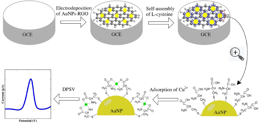 Glassy carbon electrode (GCE) modified with L-cysteine and gold nanoparticles, reduced graphene oxide (AuNPs-RGO) composite was fabricated as an electrochemical sensor for the determination of Cu2+ (Fig. 2). The AuNPs-RGO composite was formed on GCE surface by electrodeposition. The L-cysteine was decorated on AuNPs by self-assembly. Experimental conditions, including electrodeposition cycle, self-assembly time, electrolyte pH and preconcentration time were studied and optimized. Stripping signals obtained from L-cysteine/ AuNPs-RGO/GCE exhibited good linear relationship with Cu2+ concentrations in the range from 2 to 60 mgL-1, with a detection limit of 0.037 mgL-1. Finally, the prepared electrode was applied for the determination of Cu2+ in soil samples, and the results were in agreement with those obtained by inductively coupled plasma mass spectrometry [42].