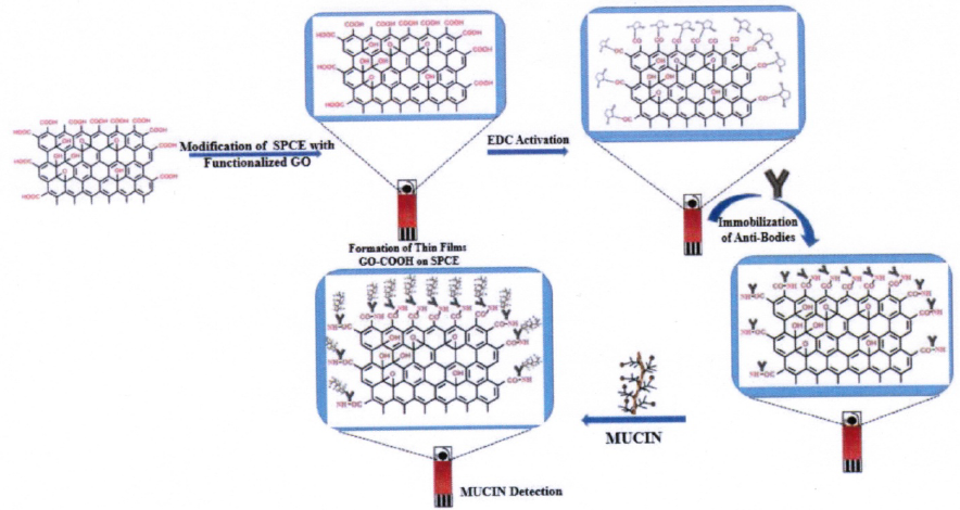 Rauf and coworkers developed for the first time a carboxylic group riched GO based disposable electrochemical immunosensor for cancer biomarker detection using methylene blue (MB). The developed immunosensor for detection of biomarker mucin1 (MUC1) is in human serum samples. In this method, they explored highly conductive surface of carboxylic group (-COOH-) rich GO on screen-printed carbon electrodes (SPCE). This modified GO-COOH-SPCE was employed for the detection of MUC1 protein based on the reaction with methylene blue (MB) redox probe using differential pulse voltammetry (DPV) technique (Fig. 3). Analytical performance of the developed immunosensor assures the applicability in clinical diagnostic applications [51].