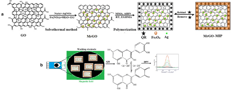 An electrochemical quercetin (QR) sensor was described that was based on the use of magnetic reduced graphene oxide (MrGO) incorporated into a molecularly imprinted polymer (MIP) on the surface of a SPE. The procedures for MrGO-MIP preparation are described in (Fig. 7a). The MrGO consists of reduced graphene oxide (rGO), magnetite (Fe3O4) and silver nanoparticles (Ag). The analyte (QR) was electrostatically adsorbed on the surface of the MrGO. Finally, the MIP was deposited via in-situ polymerization. The electrode’s schematic diagram with possible reduction mechanism for QR is shown in (Fig. 7b). Under optimal conditions, the modified electrode has a linear response in the 20 nM to 250 μM QR concentration range [92].