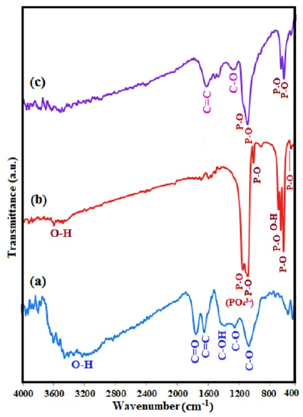 The compositions of the resulting GO, HAP and rGO/HAP/Ag composites were investigated by FTIR spectroscopy. The FTIR spectrum of GO in Fig.1(a) showed absorption bands at 1037, 1224, 1346, 1726, and 1616 cm-1, which are ascribed to alkoxy C–O stretching vibration, epoxy C–O stretching vibration, C–OH stretching vibration, C=O stretching vibration, and C=C benzene ring mode, respectively. Also, the broad peak around 3334 cm−1 was due to the stretching vibration of OH [40]. In the spectrum of the prepared HAP (Fig. 1(b)), the asymmetric stretching vibration (υ3) and bending vibration (υ4) modes of PO43- ion were detected at around (1031, 1099 cm−1) and (568, 605 cm−1), respectively. The symmetrical stretching vibration modes (υ1 and υ2) of PO43- ion were also found at around 962 and 468 cm−1, respectively. The stretching and librational modes of the OH- ions were detected at around 3550 and 634 cm−1, respectively [41]. The FTIR spectrum of the rGO/HAP/Ag nanocomposite (Fig.1(c)) showed that the bands for oxygen-containing functional groups of GO were decreased or even some of them vanished entirely. Moreover, a new absorption band appeared at 1564 cm−1, which may be assigned to the C=C stretch vibration of graphene sheets [26]. The absence of the O-H band at 634 cm−1, compared to HAP and the appearance of the C–O stretch band at 1224 cm−1, indicated the reduction of graphene oxide and formation of the rGO/HAP/Ag nanocomposite.