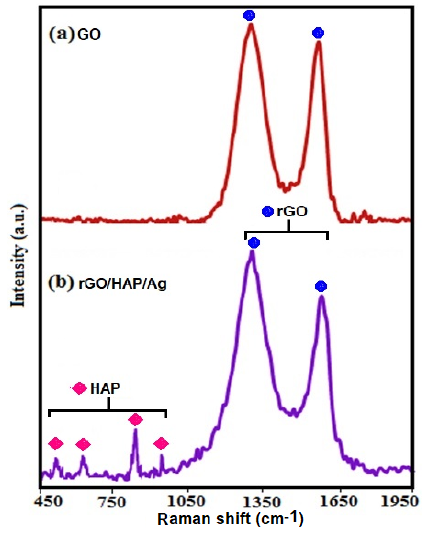 Raman spectroscopy is a powerful tool to characterize significant structural changes of GO during the composite synthesis. Fig. 2 presents the Raman spectra of GO and rGO/HAP/Ag samples. For pure GO in Fig. 2(a), two characteristic peaks corresponding to the G and D bands of graphene nanosheets were observed at 1590 cm-1 and 1318 cm-1, respectively. The G band was assigned to the E2g mode of C sp2 atoms, while the D band was due to the A1g symmetry and related to the local defects and disorders [40]. As shown in Fig. 2(b), the characteristic two bands of GO in the rGO/HAP/Ag composite appeared at 1594 cm−1 and 1319 cm−1, confirming the presence of GO in the nanocomposite. The Raman peaks of the HAP phase were also observed at 470, 572, 960 and 1035 cm-1. These peaks were related to the υ2 (PO43-), υ4 (PO43-), υ1 (PO43-) and υ3 (PO43-) vibration modes of the phosphate groups, respectively [35-36]. The ID/IG ratios of GO and rGO/HAP/Ag were found to be 1.09 and 1.25, respectively. It is observed that the ID/IG intensity ratio of GO/HAP/Ag are higher than that of pure GO, suggesting a higher level of disorder of the graphene layers during the functionalization process. Raman spectra further confirmed the successful synthesis of rGO/HAP/Ag composite.