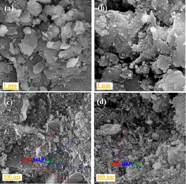 Fig. 5 shows the SEM images of the as-prepared GO and rGO/HAP/Ag nanocomposite at different magnifications. The SEM micrograph of pure GO in Fig. 5(a) shows the highly porous and layered structure of GO having large stacks, possibly consisting of hundreds of GO nanosheets. It should also be noted that the surfaces of the GO sheets are quite flat and smooth. SEM images of rGO/HAP/Ag in Fig. 5(b-d) show a completely different morphology. It is clearly evident that the nanocomposite product consists of extremely fine particles with sphere-like and rode-like morphologies that appreciably aggregated as clusters due to the extremely small dimensions and high surface energy of the obtained nanoparticles. The SEM images shows GO nanosheets were successfully decorated with the spherical Ag and rod-like hydroxyapatite nanoparticles. Also, these images showed that the hydroxyapatite and silver nanoparticles were homogeneously distributed on the surface of graphene sheets.