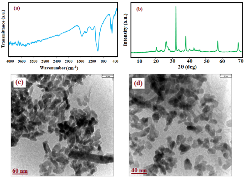 The functional groups present in the samples were recorded by a Schimadzu system FT-IR 160 spectrophotometer in transmission mode from 4000 to 400 cm-1 using KBr pellets. Raman spectra of the samples were obtained using a Raman microscope (Model: SENTERRA (2009), Germany) with a laser 785 nm. The XRD patterns of the samples were analyzed on an X-ray diffractometer (PANalytical/X’Pert Pro MPD) using Ni-filtered Cu Kα radiation (λ=1.54059 Å). The UV-Visible absorption spectra of samples were obtained using a double beam UV-Visible spectrometer (Cary 100, VARIAN) operated at a resolution of 2 nm with quartz cells with path length of 1 cm in 200-800 nm range. The morphology and elemental analysis of samples were observed by a MIRA3 TESCAN scanning electron microscope (SEM) equipped with a link energy-dispersive X-ray (EDX) analyzer. Transmission electron microscopy (TEM) observations were determined on a Philips CM120 microscope at the accelerating voltage of 200 kV.