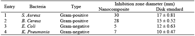 The bacterial strain of Bacillus cereus (PTCC 1556), Staphylococcus aureus (PTCC 1112), Escherichia coli (PTCC 1330) and Klebsiella pneumonia (PTCC 1053) were used to evaluate the antibacterial properties of as-synthesized GO, HAP, rGO/HAP, rGO/HAP/Ag nanocomposite and Ag NPs using modified Kirby-Bauer disk diffusion method. The Bacteria were cultured for 18 h at 37˚C in the Nutrient agar medium and then adjusted with sterile saline to a concentration of 2 ×106 cfu/mL. Bacterial suspensions in Petri dishes (8 cm) containing sterile Mueller-Hinton agar (MA) were cultured using a sterile cotton swab. The compounds were dissolved in water and the sterile paper discs of 6 mm thickness were saturated with 35 μl of samples and then placed onto agar plates which had previously been inoculated with the tested microorganisms. Amikacin (30 μg/disk) was used as the positive control. After incubation for 24 h at 37 ˚C the antibacterial activity was measured as the zone of inhibition (mm) around the disc.