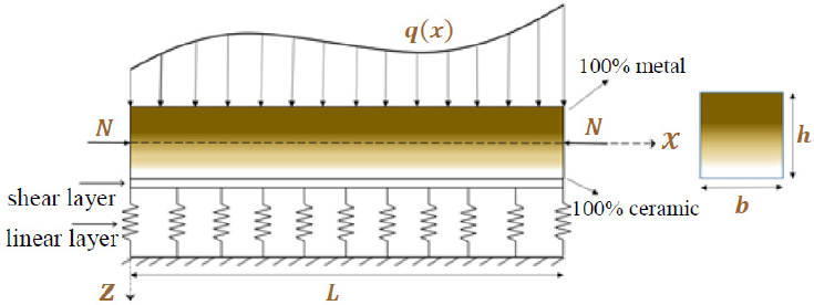 in which , , represents applied axial compressive load, and are transverse and axial distributed loadings and and are linear and shear parameters of elastic foundation.