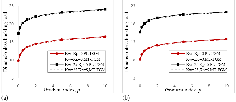 The effect of elastic foundation on non-dimensional buckling load of FG nanobeam with varying of gradient index at is presented in Fig. 2(a, b) and the variation of non-dimensional buckling load with and without elastic foundation based on both PL and MT models are compared. It is seen from the results of this figure that the dimensionless buckling loads of FG nanobeam embedded in elastic medium are larger than that of FG nanobeam without elastic foundation. This is since when the both foundation parameters increase the nanobeam becomes stiffer. Also, the MT scheme estimates lower values for the non-dimensional buckling loads compared to the power-law model. The reason is that, MT model provides smaller values for Young’s modulus than the power-law model and thus leads to a more flexible structure. Also, it is noticed from this figure that the dimensionless buckling load is prominently affected by lower values of gradient indexes. Also, increasing nonlocal parameter shows a decreasing effect on the dimensionless buckling load. So, as a general consequence, the presence of nonlocality and elastic foundation softens and stiffens the structure, respectively.