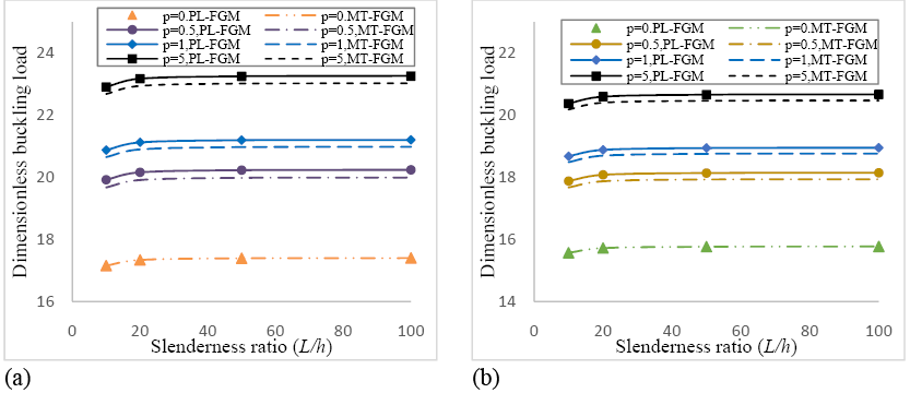 for various values of gradient indexes used in MT model as well as PL model. It is seen that, dimensionless buckling load increases with increase in slenderness ratio. But this observation is accurate when slenderness ratio is in the range . Therefore, it can be deduced that effect of slenderness ratio on dimensionless buckling load is approximately diminishes for values greater than .