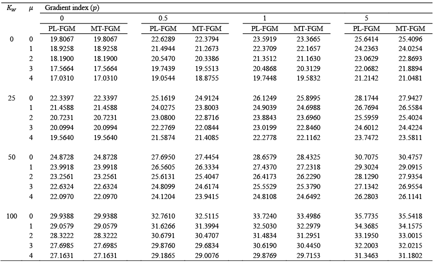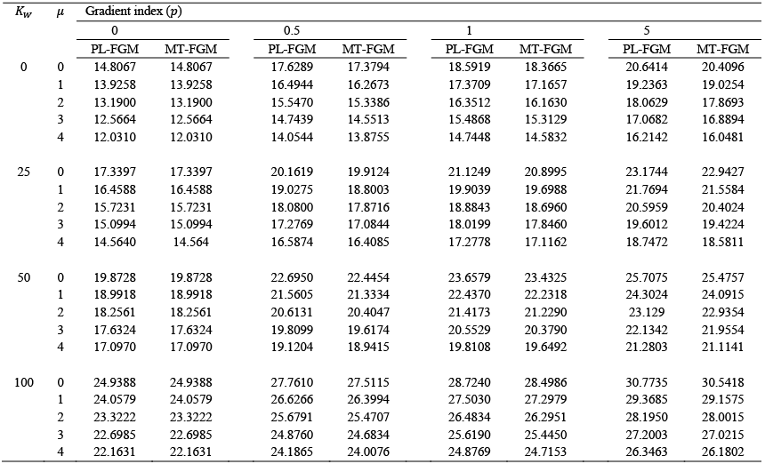 nonlocal parameters, foundation parameters and slenderness ratios are presented in Tables 3-5. The present results for MT model and PL model are referred to as MT-FGM and PL-FGM, respectively. It can be noticed from the tables that non-dimensional buckling loads predicted with respect to PL model are larger than that of MT homogenization scheme, related to the fact that for a constant gradient index, FG nanobeam becomes more flexible based on MT homogenization scheme compared to the PL model. The obtained results using MT and PL models are the same at since nanobeam is fully ceramic. From this point of view, the difference between results of these two models is significant when gradient index value is more than zero. Considering explanationsand according to Tables 3-5, it must be noted that, as gradient index increases dimensionless buckling load increases (constant nonlocal parameter) too. In addition, at a fixed gradient index the dimensionless buckling load decreases as nonlocal parameter increases. Furthermore, it should be stated that when the foundation parameters (Winkler’s and Pasternak’s parameter) increase, the non-dimensional buckling load increases which indicates the stiffening effect of foundation parameters on the FG nanobeam.