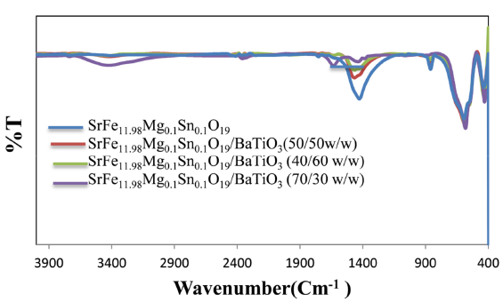 The FTIR spectrum of SrFe11.98Mg0.1Sn0.1O19 and SrFe11.98Mg0.1Sn0.1O19/BaTiO3 (50/50, 40/60, 70/30 w/w) nanocomposites was shown at Fig. 1(a-d). FTIR spectrum, implying the preparation processes of FTIR. In pure SrFe11.98Mg0.1Sn0.1O19 nanoparticles, show the peaks at 423.12 and 582. 48cm-1 was related to the vibration of the Fe-O bond at tetrahedral and octahedral vibrations (Fig.1a) [16]. In SrFe11.98Mg0.1Sn0.1O19/BaTiO3 nanocomposite, besides hexaferrite vibrating modes (550, 549.62 and 547.39 cm-1), the new bands at 589.03, 590.01 and 592.0.5 cm-1 correspond to the vibration of Ti-O octahedron of perovskite structure (fig 1b, 1c, and 1d). [17].
