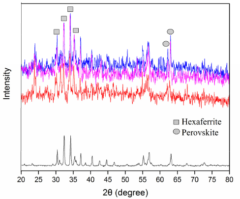 By using various kinds of magnetoelectronic devices, electromagnetic radiation interference results in human health damage and disclosure of information. As the result, electromagnetic absorber materials (EMA) have been developed in recent years [1-3]. M-Type hexaferrites with high Curie temperature, high electrical resistivity, and large magnetocrystalline anisotropy are the perfect candidate to be used as EMA materials [4, 5]. Till now, single compounds like M-type hexaferrites can’t be prosperous in fulfilling all properties that ideal EMA (like maximum electromagnetic attenuation, and easy fabrication process) should have; however, composite materials act impressively [6]. On the other hand, for maximizing the attenuation of the electromagnetic wave, the electric and magnetic parts of absorber should be matched with each other [7]. Nanocomposites with two different phases of magnetic and dielectric materials can fulfill the goal of maximum attenuation and excellent impedance matching[8]. Hence, the new kinds of composites were synthesized by hexaferrites and the materials with large dielectric constant such as perovskite was added to maximize the attenuation of electromagnetic wave[9].
