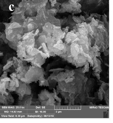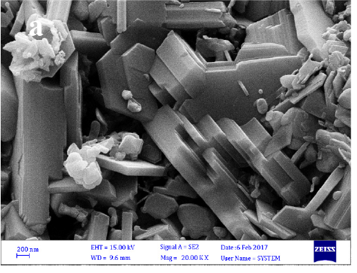 FESEM micrographs of samples were shown at Fig. 3 (a-d). Hexagonal platelet structure of SrFe11.98Mg0.1Sn0.1O19 reveals the formation of hexaferrite (Fig. 3a). In SrFe11.98Mg0.1Sn0.1O19/BaTiO3 nanocomposites, the spherical particles of BaTiO3 and hexagonal structure of SrFe11.98Mg0.1Sn0.1O19 confirm the existence of nanocomposites (Fig. 3b, 3c, and 3d). In all products agglomeration of samples was happened due to magnetic properties of M-type hexagonal ferrites [20-23].