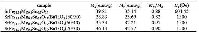 Stoichiometric amounts of SrFe11.98Mg0.1Sn0.1O19 and BaTiO3 was weighted and mortgaged. The certain weight ratio (50/50, 40/60, 70/30) of samples was a ball- milled for 36h. The samples were dried at the vacuumed oven.
