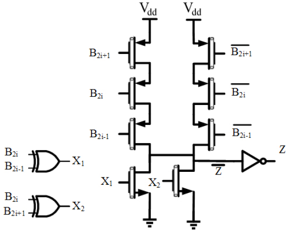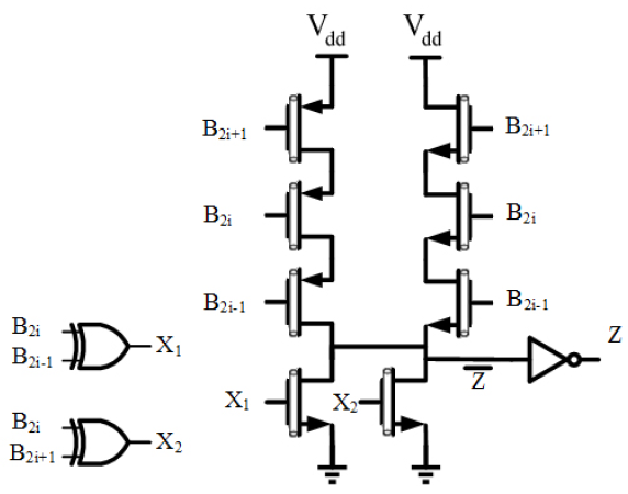 To calculate gate-level delay from inputs to the outputs, it is clear that the critical path starts from encoder section where the parameter Z is being generated and ends in the PP where the gate of final Transmission Gate (TG) is fed by Z signal. Compared with [14], which has a gate level delay equal to two XOR logic gates plus one transistor, in the proposed scheme the delay has been reduced to less than two XOR gates considering the fact that the propagation delay for Z is equal to one XOR gate plus one inverter. In [15], although the gate level latency is claimed to be one XOR gate plus one transistor, the inverted state of the PP is obtained at the output node which needs an extra inverter to get the PP itself. Besides, in the design reported in [15], four parallel paths were used to produce the output while in the proposed architecture this problem is clearly improved by using two paths in parallel.