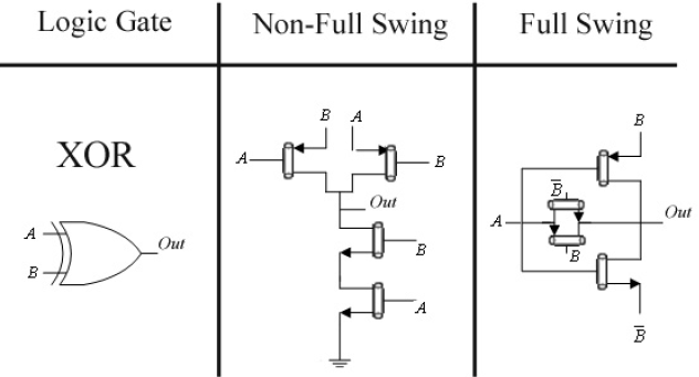 To reduce total transistor count, the XOR gates which are generating X1 and X2 output can be implemented with non-full swing four transistor gates proposed in [25] since they are driving the gates having only NMOS transistor. Compared to design reported in [14] which has employed 10 transistor XOR/XNOR gates originally reported in [26], all of the full swing XOR and XNOR gates in this work have been implemented by means of 6 transistor gates described in [25]. Fig. 2 shows the redesigned XOR gates in CNTFET technology which are utilized in our scheme.