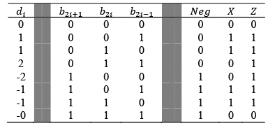 Now, comparison of (2) and (5) demonstrates that employing such coding which is known as radix-4 Booth algorithm, the number of PPs (defined by n) are almost halved. Therefore, huge speed enhancement is expected if this method is utilized for the hardware implementation of a parallel multiplier. Meanwhile, the coefficient di in Eq. (5) is an indication of scale factors (-2X, -X, 0, X, 2X) for multiplication process. Table 1 summarizes the conventional truth table used for radix-4 Booth scheme implementation.
