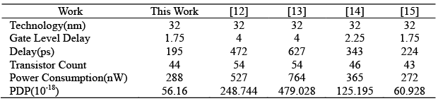 Table 3 summarizes the comparison results based on simulations in CNTFET 32nm process. To interpret the results realistically, the Power Delay Product (PDP) was calculated for all these designs and is also added to the table for a better comparison. The PDP specification illustrates that our work has better performance than previous designs. It must be mentioned that all simulations are performed at the operating frequency of 100MHz.